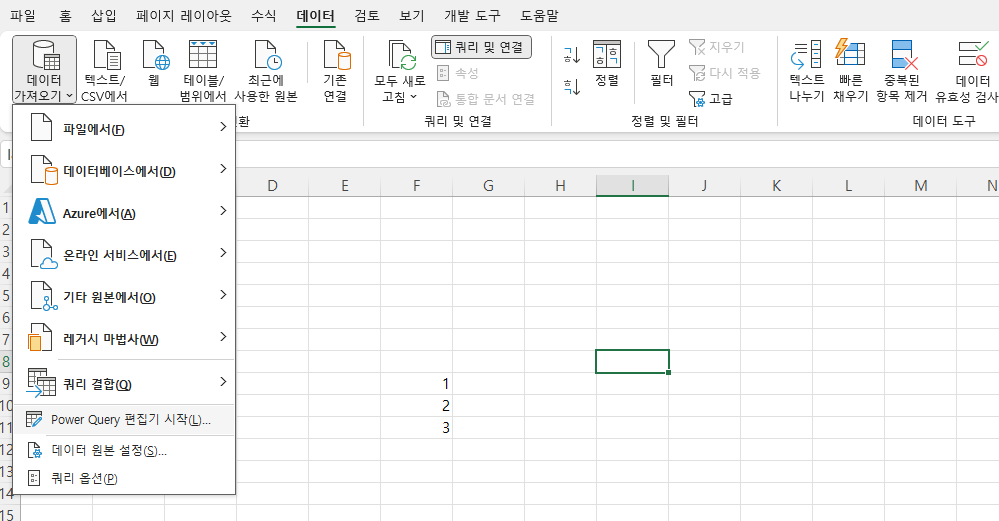 - 데이터 > 새 쿼리에서 데이터 소스 선택.